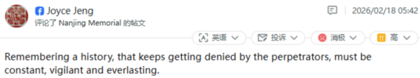 国外网友留言:“铭记这段被施暴者否认的历史,这份铭记必须持之以恒、保持警醒、永不磨灭。”