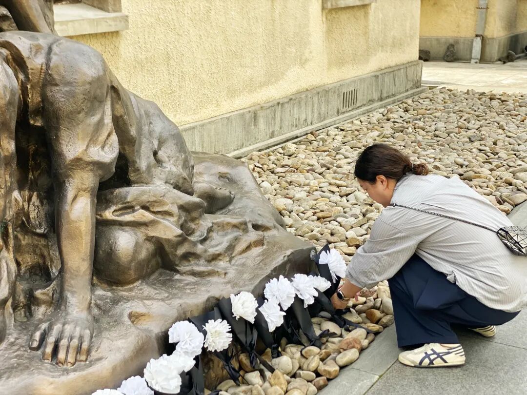 观众将亲手制作的纸花敬献于“慰安妇”主题雕塑前。不一会儿,雕塑前便摆满了承载着深切哀思的白花,寄托对日军“慰安妇”制度受害者的缅怀。