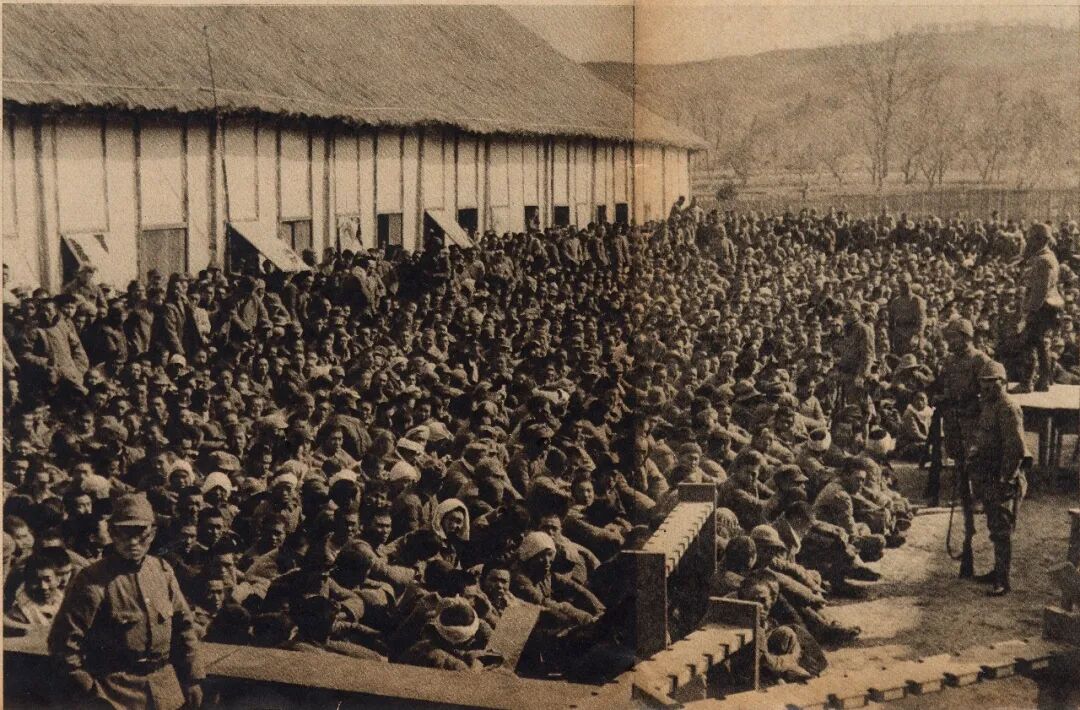 日军第13师团步兵第65联队(两角部队)将放下武器的约1.5万名中国军人集中在幕府山一带准备加以屠杀——1937年12月16日 上野特派员摄,来源《朝日画报-支那战线写真》第30卷第1号
