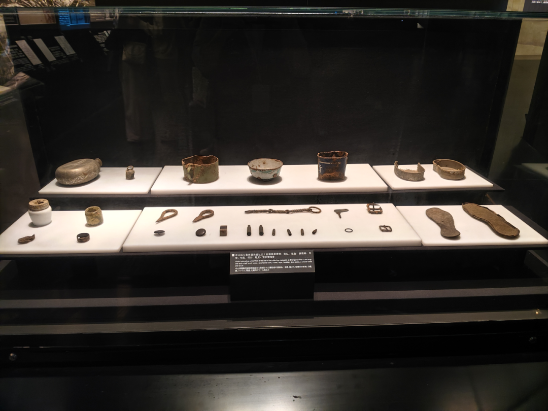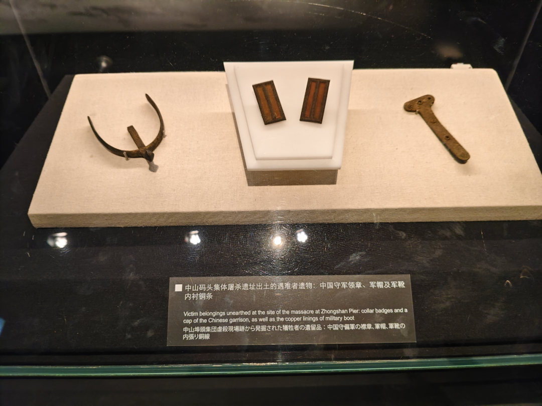 中山码头集体屠杀遗址出土的遇难者遗物,分别是中国守军领章、军帽、军靴内衬铜条,以及茶缸、饭盒、搪瓷碗、印章、钥匙、带扣、靴底、雪花膏瓶等
