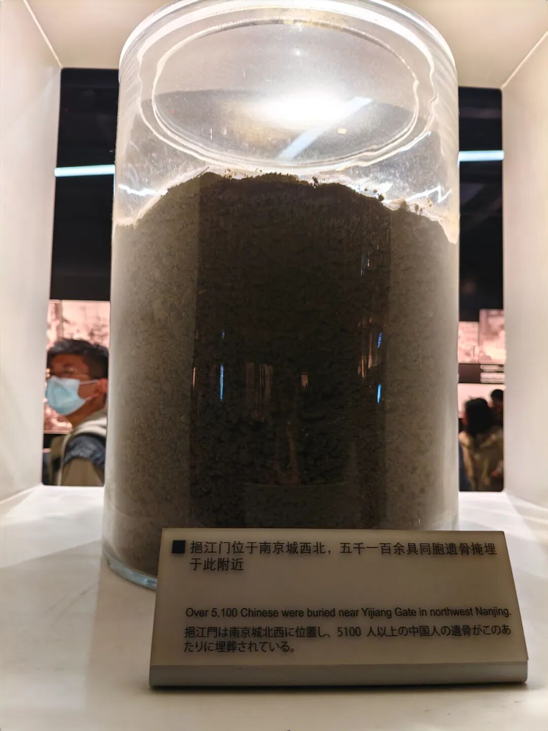 “你看图片说明上写着,这些土是从南京城各处南京大屠杀遇难同胞丛葬地和集体屠杀遗址采集来的。”