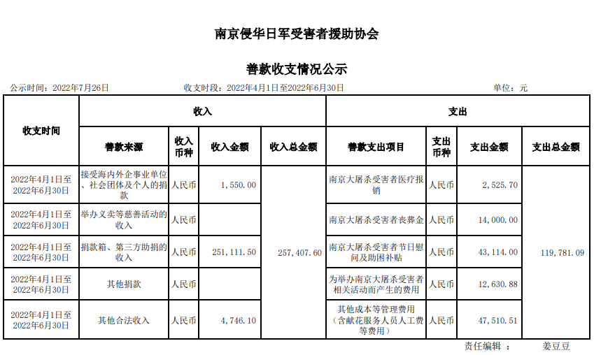 南京侵华日军受害者援助协会善款收支情况公示(2022年第二季度)