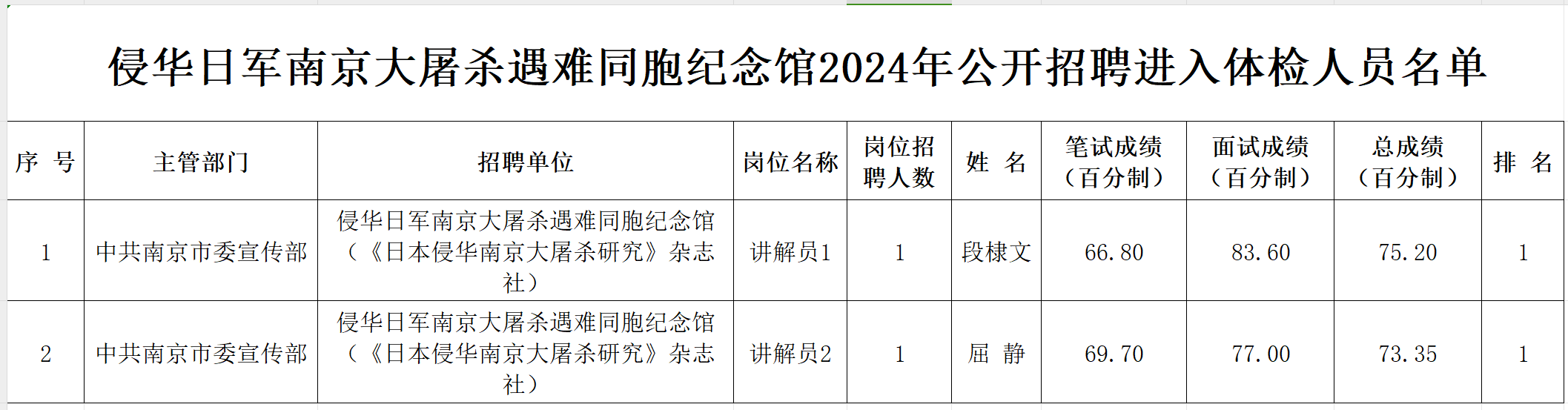 侵华日军南京大屠杀遇难同胞纪念馆2024年公开招聘进入体检人员名单