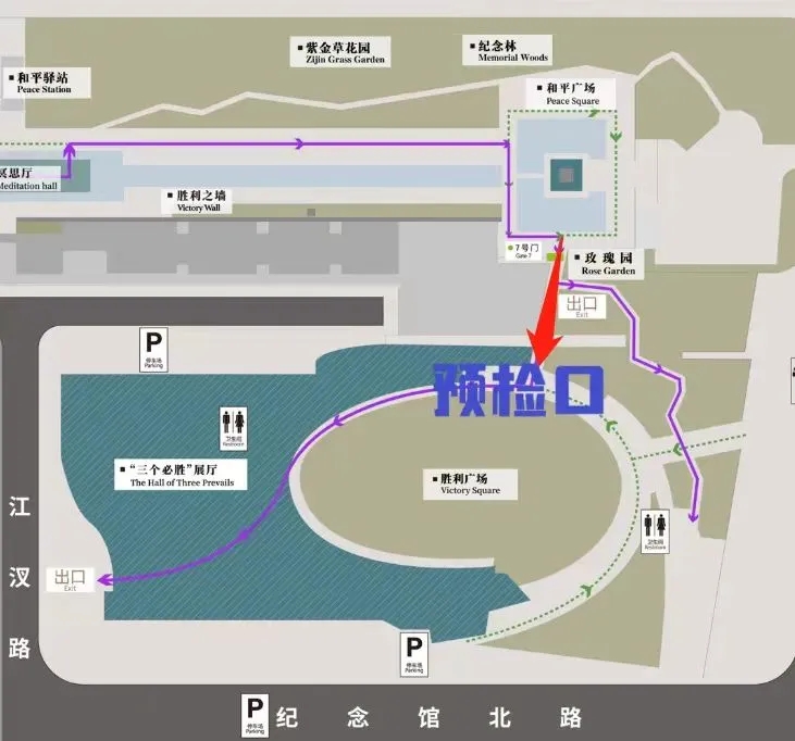 如您仅预约“三个必胜”专题展区,可按图示途经茶亭东街、江汊路、纪念馆北路,前往预检口,排队查验预约信息。