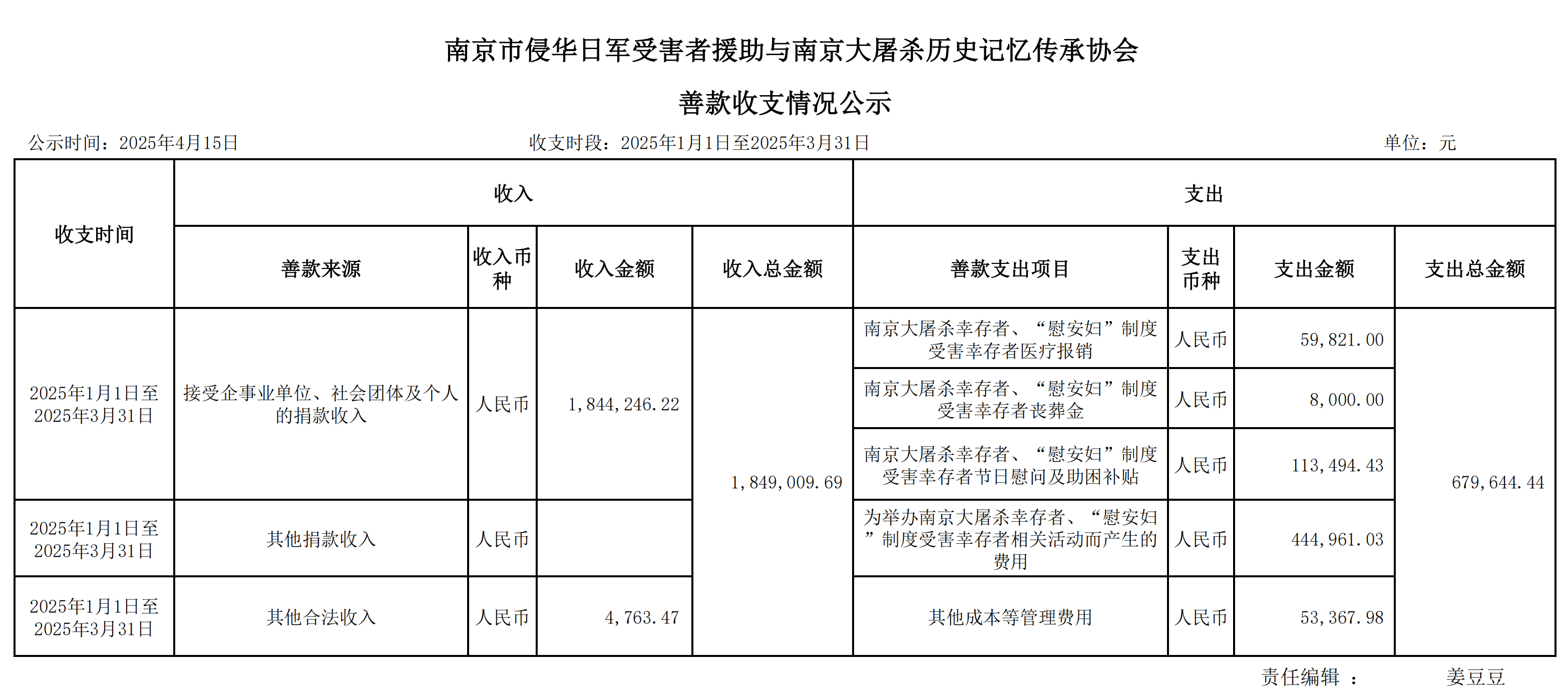 南京市侵华日军受害者援助与南京大屠杀历史记忆传承协会善款收支情况公示