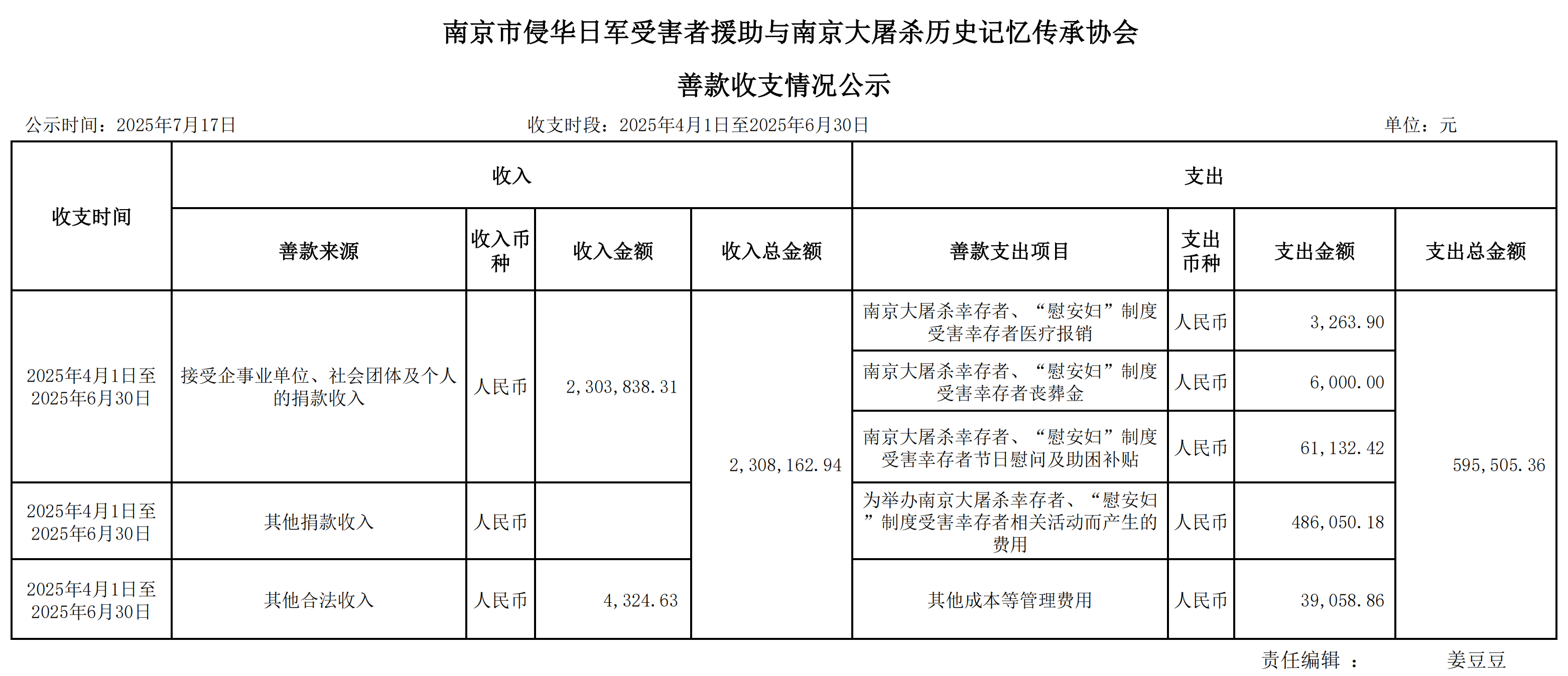 南京市侵华日军受害者援助与南京大屠杀历史记忆传承协会善款收支情况公示