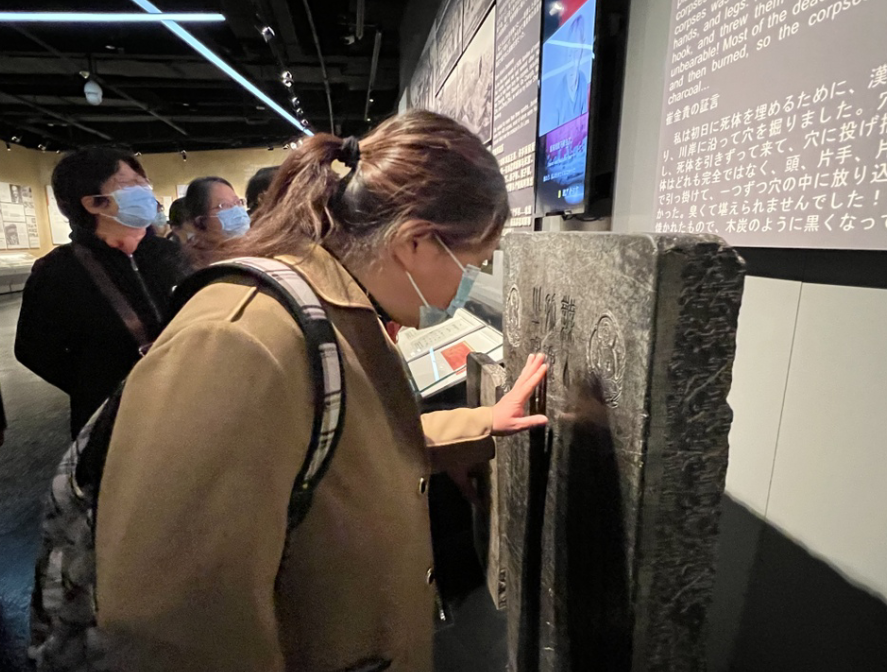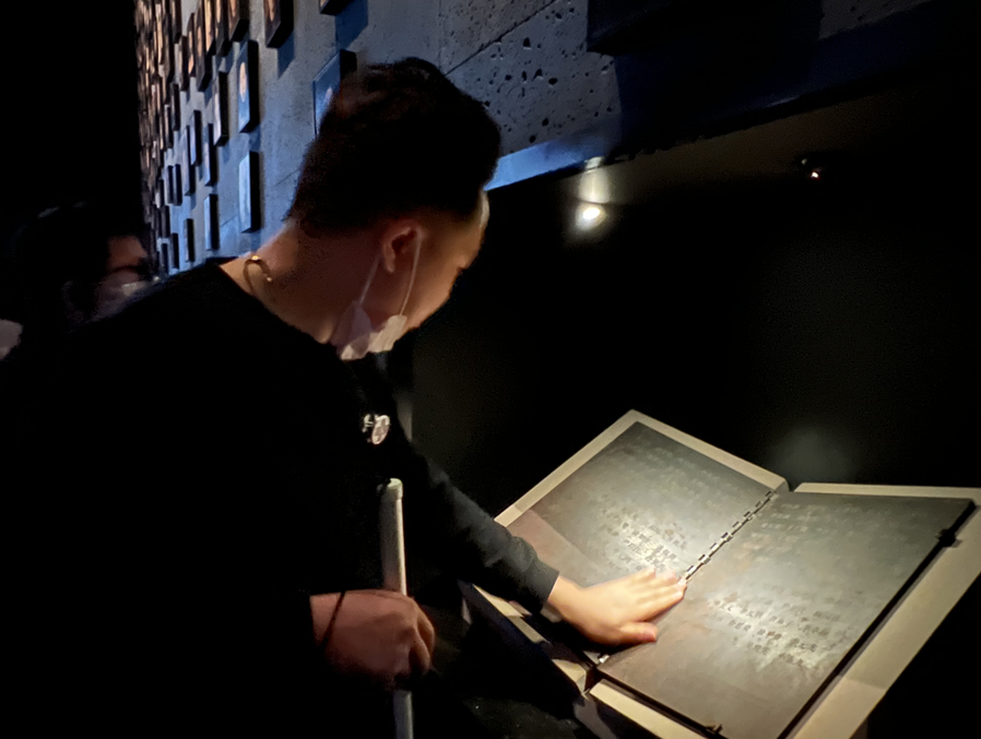 記念館のスタッフとボランティアの付き添いと助けの下で、みんな追悼広場で花輪を献上して遇難同胞を追悼してから、展示ホールに移動した。記念館は特別に史料陳列室の入口に長いテーブルを置いて、その上に「国家追悼式の鼎」と「平和の鐘」の模型を据えた。視覚障害者たちは鼎と鐘にタッチし「平和の鐘」を鳴らし、そして展示ホールで「鉄の書」をめくって鉄証は山の如くということを感じる。