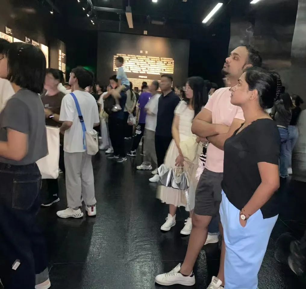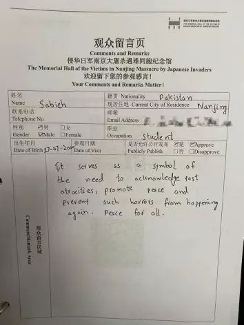 今年の中国伝統的な祝日である中秋節、国慶節の連休には、累計20万人近くの観客が記念館を見学した。このうち、外国人観客は730人で、韓国、日本などの国と地域から来ている。パキスタンの若者Sabiehさんは見学後メッセージ「ここは残虐な歴史を学び、平和を促し、このような惨劇が二度と起こらないようにする象徴的な地です。全ての人に平和を」と書いた。インドから来た女の子のSudeepti Mundirintiさんとモーリシャスから来たGandhish Irvidhesh Singhさんは南京医科大学の留学生で南京に5年間生活している。Sudeepti Mundirintiさんは中国人のクラスメートから初めて南京大虐殺の歴史を知った時、大変驚いたという。10月5日二人が2度目に記念館を見学し、この歴史の詳細をより深く理解した。そして感慨深げに言った:「なぜ戦うの?」