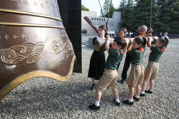 At 8.15 a.m., the ceremony of ringing the Peace Bell was held at the Public Memorial Square of the Memorial Hall. Six descendants of Nanjing Massacre survivors and representatives of Nanjing youths rang the Peace Bell together. The sound of the bell echoed over the square for a long time, warning people to remember the history, safeguard historical truth, safeguard national dignity and uphold peace and justice.