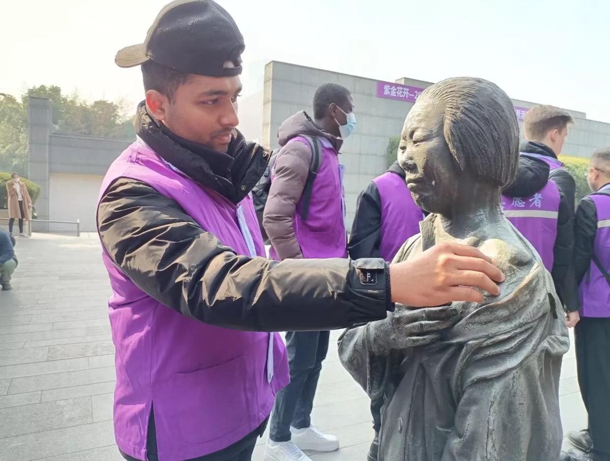 This volunteer comes from India. Born in 1996,he came to Nanjing over six years ago. He is pursuing a master’s degree in medicine in Southeast University after getting a bachelor’s degree there. In the square of the Memorial Hall, he touched a scar on the bronze statue of Ni Cuiping, a survivor of the Nanjing Massacre. The scar from a gunshot wound by the Japanese soldiers is clearly visible on the statue. “My heart aches for her. I major in surgical medicine and know painful it was. I will learn from Dr Wilson and stay in Nanjing after graduation. I will dedicate myself for the benefit of the people in Nanjing.”