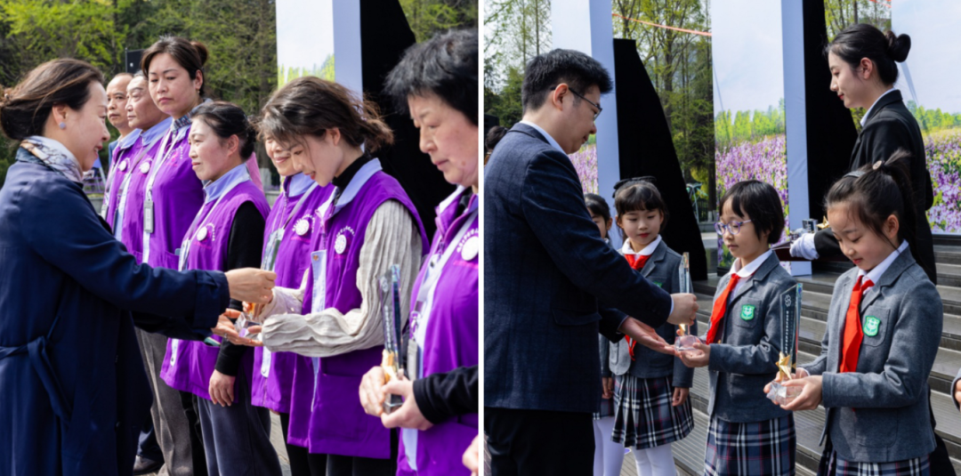 Ling Xi and Shi Pengcheng, deputy directors of the Memorial Hall, award a prize to excellent volunteers and little peace ambassadors, respectively.