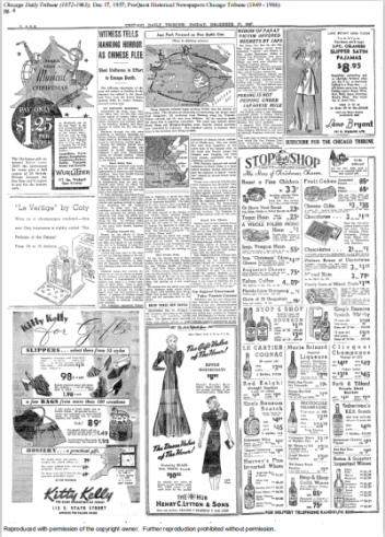 “Witness Tells Nanking Horror as Chinese Flee,” a report sent by Menken from China, was published on Page 4 of The Chicago Daily Tribune on December 17, 1937