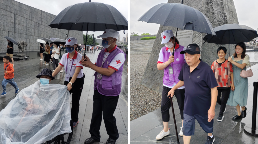 A light rain fell on the third day of the holiday, but it didn’t stop people from going out and visiting the Memorial Hall. The staff members of the Memorial Hall immediately cleared away water on the ground to ensure safe access to the Memorial Hall. The volunteers prepared wheelchairs for visitors with difficulty walking in a timely manner and led them into the Memorial Hall through the green channel.