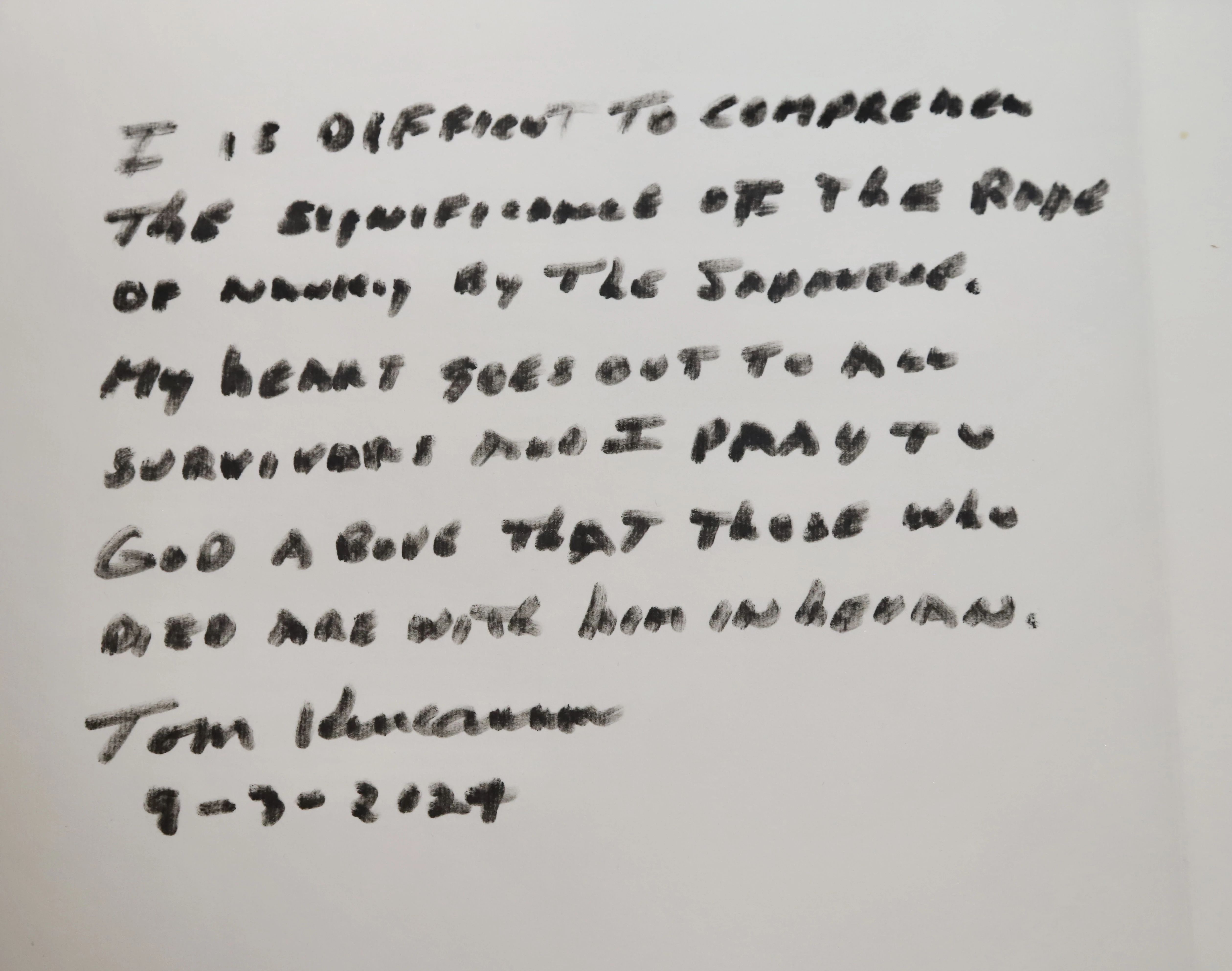 Tom Kincannon, Margaret’s husband and a former U.S. Navy sailor who serves as an advisor to the Sino-American Aviation Heritage Foundation, had read reports about the Nanjing Massacre before his visit but often felt unsettled by them. He was grateful for all the efforts made by the Memorial Hall and also hoped to contribute in some way. He wrote: “It is difficult to comprehend the significance of the ‘The Rape of Nanking’ by the Japanese. My heart goes out to all survivors.” Margaret wrote: “These exhibits provide a much great understanding of “The Rape of Nanking” that I have heard about. What an impressive display of history!