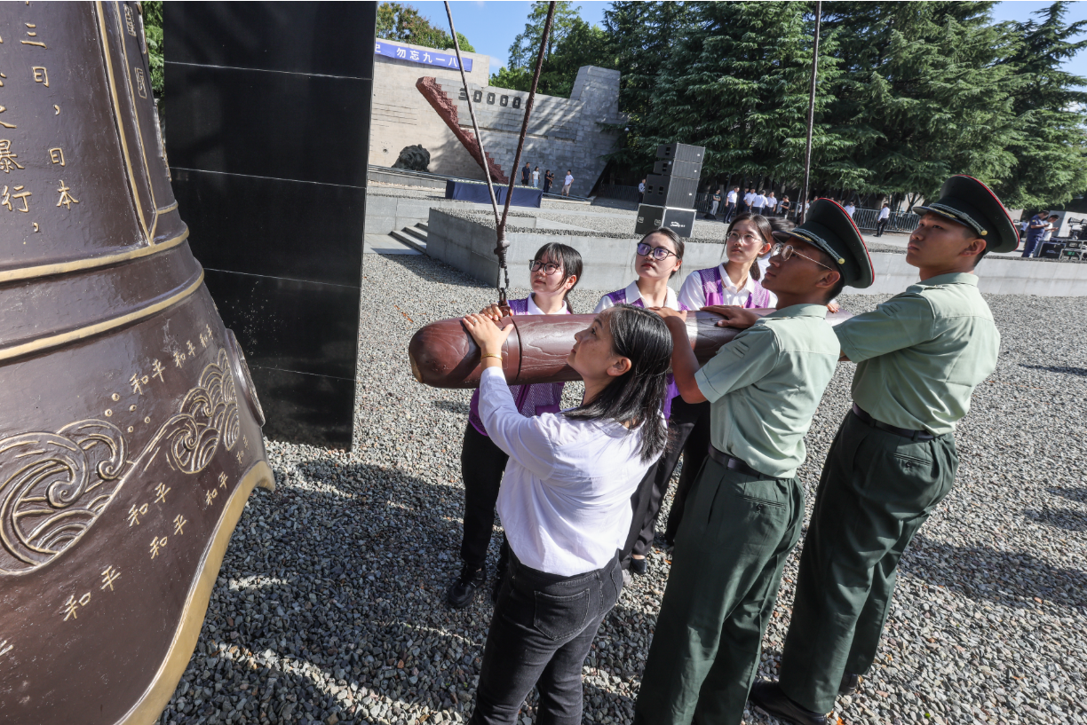 Six representatives, including Nanjing Massacre Memory Inheritors, Zijin Grass Volunteers, military students and others, rang the Peace Bell, reminding everyone to cherish peace and remember history. Mei Yuxiao, a Zijin Grass Volunteer from Nanjing University's School of Journalism and Communication, held the bell mallet tightly and said, "The ringing bell comforts the victims and serves as a reminder to learn from history and cherish peace. As a youth of the new era, I must not forget history and strive to be of service to my country."