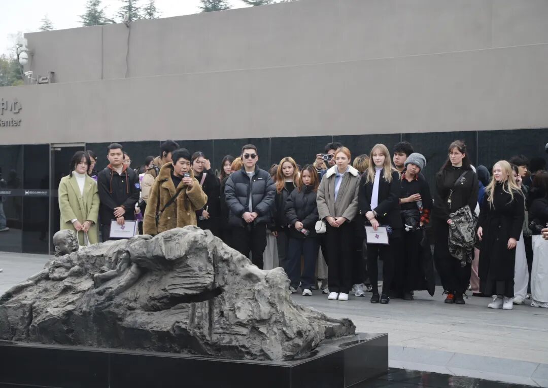 “纪念馆在侵华日军南京大屠杀江东门集体屠杀地及遇难同胞丛葬地遗址上建成开放,整体造型如一艘‘和平之舟’……”讲解员细细讲述,带领国际青年读懂纪念馆建筑承载的历史记忆与和平祈愿。行至雕塑广场,以南京大屠杀幸存者常志强一家为原型的雕塑,揪住了所有人的心。